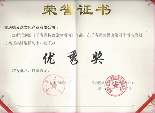 2017年1月4日,“長壽湖菩提山活動策劃金點子”評選會議在長壽舉行。由重慶旅游與文化研究院旗下公司重慶德義達文化產(chǎn)業(yè)有限公司提交的策劃方案,在與全國40多套方案的角逐中榮獲優(yōu)秀獎。