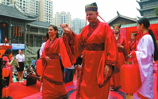 在南溪古街,由12名歐洲熊貓粉絲傾情演繹的漢式集體婚禮成為線路考察中的一大亮點(diǎn)。在悠揚(yáng)的誦讀聲中,身著漢式服裝的“新人”依次入場,禮道兩旁的侍女持宮燈引導(dǎo),新人行拜堂、沃盥、對(duì)席、同牢、合巹、結(jié)發(fā)、執(zhí)手禮,整套漢式婚禮禮儀逐一演繹,讓習(xí)慣了婚紗禮服的老外們親身感受了一番中國傳統(tǒng)婚俗文化。在這里,與會(huì)嘉賓們還實(shí)地參觀了著名小吃“南溪豆干”的制作流程,欣賞了極具當(dāng)?shù)靥厣墓艠繁硌荨?