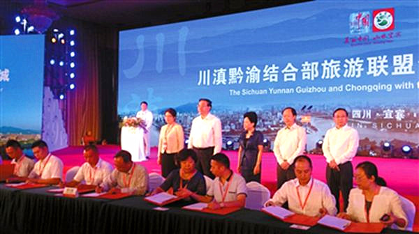 開幕式剛剛結(jié)束,川滇黔渝結(jié)合部旅游聯(lián)盟推介會(huì)暨旅游產(chǎn)業(yè)項(xiàng)目簽約儀式就成為各方關(guān)注的焦點(diǎn)。四川省宜賓、瀘州、自貢、內(nèi)江,貴州省遵義、畢節(jié),云南省昭通,重慶市江津區(qū)等8個(gè)市(區(qū))旅游部門的代表向參會(huì)嘉賓介紹了各自的旅游資源和旅游產(chǎn)品。